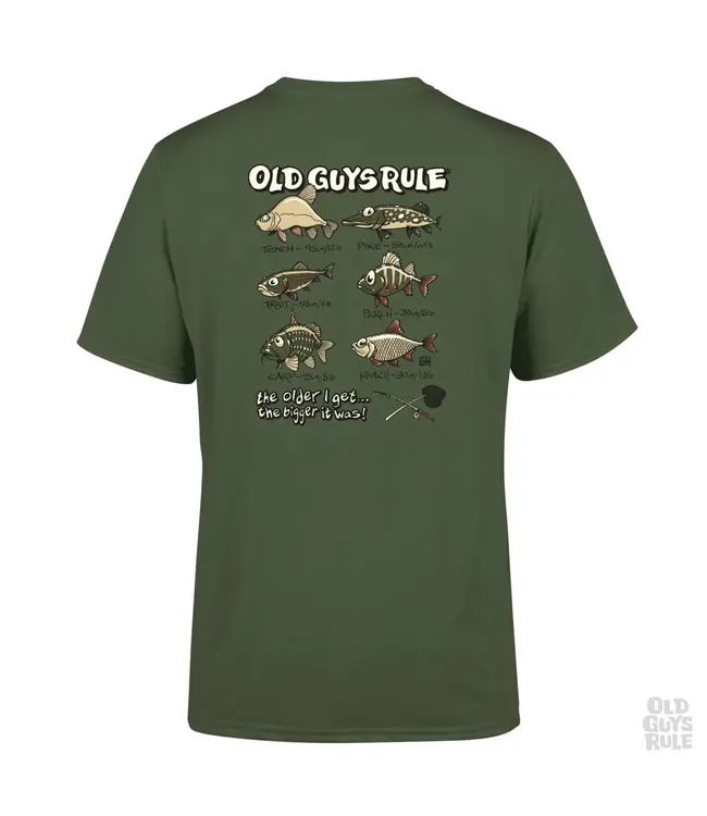 But it's the graphic that truly makes a splash. Illustrated fish, each one seemingly larger than life, adorn the back, serving as a playful reminder of the stories we tell about the ones that got away. And with the strapline "The Older I Get....The Bigger It Was!"